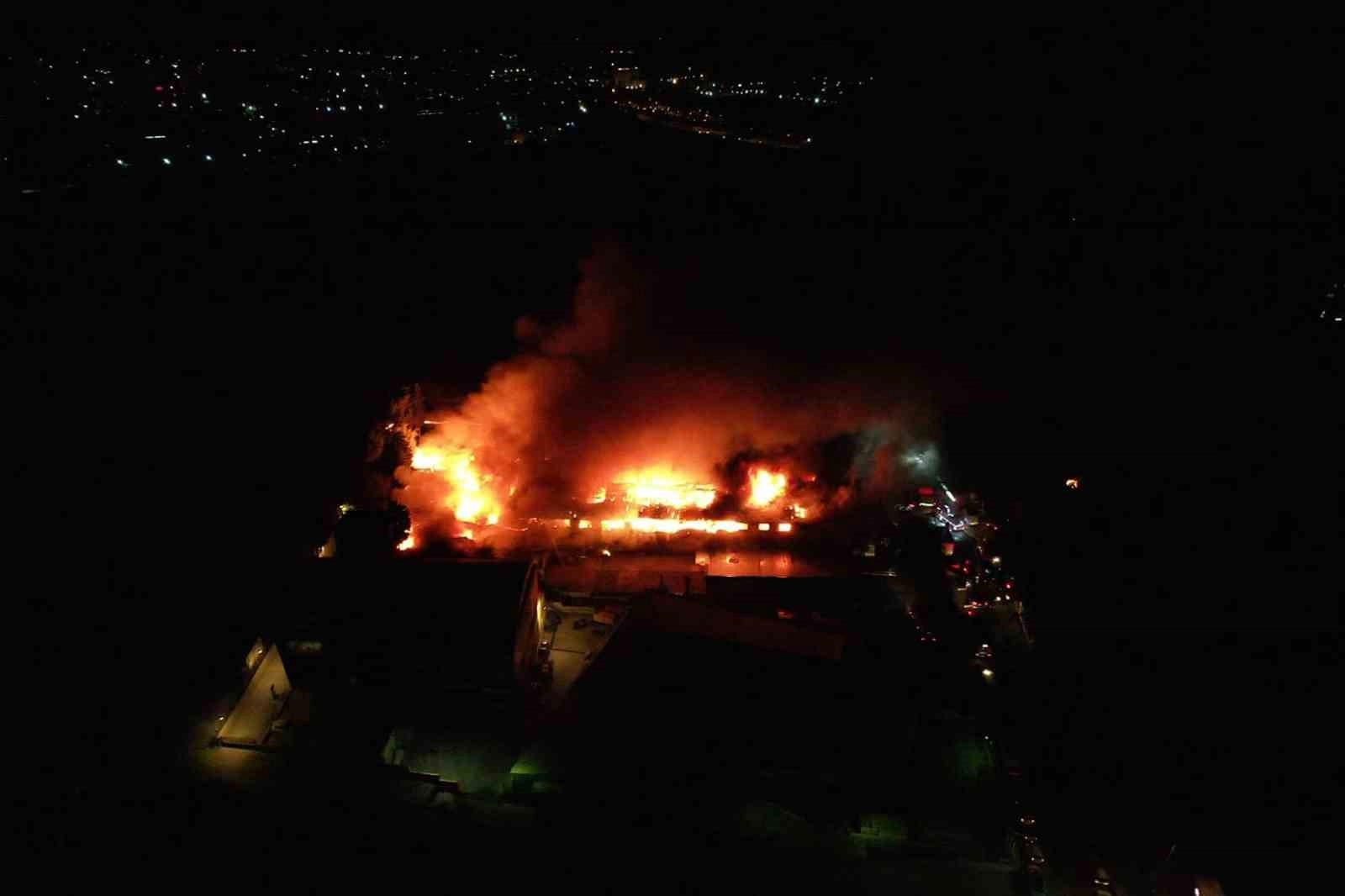 Beylikdüzü Haramidere’de Beysan Sanayi Sitesi’nde bulunan bir mobilya fabrikasında henüz bilinmeyen bir nedenle çıkan yangın, havadan görüntülendi.