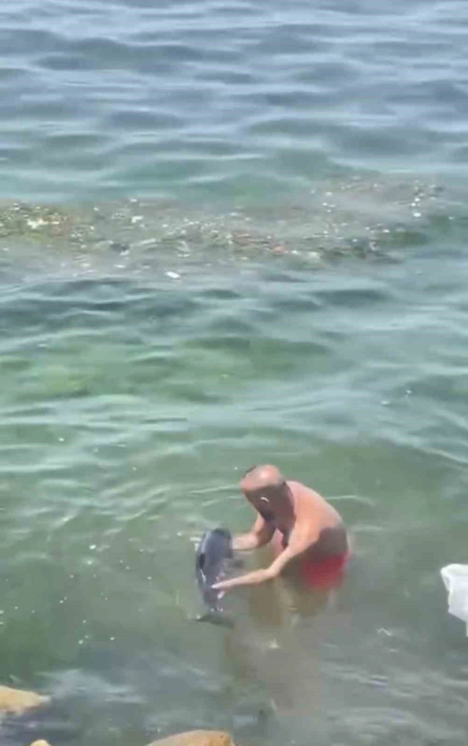 Bursa’nın Kurşunlu sahilinde ağ atan balıkçıların ağına yavru yunus balığı takıldı. Çırpınan yunusu fark eden balıkçılardan biri hemen suya atlayıp, yunus balığını kurtarmak için seferber oldu. Dakikalarca uğraşan balıkçı, yunus balığını ağdan kurtarıp tekrar denize bıraktı. Yunus balığının kurtarılma anı ise kameraya yansıdı.