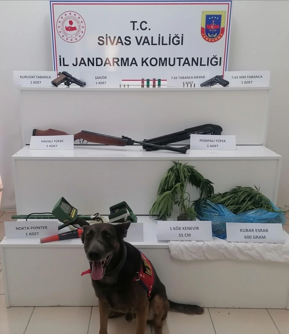 Sivas İl Jandarma Komutanlığı ve Gürün İlçe Jandarma Komutanlığı ekiplerince ortaklaşa bir operasyon düzenlendi. Alınan istihbari bilgi üzerine Gürün ilçesinde yaşayan A.S. isimli şahsın evine operasyon yapıldı. Narkotik köpeği Raket’in de destek verdiği operasyonda; 1 adet 7.65 milimetre çapında tabanca ve şarjör, 4 adet 7.65 milimetre çapında tabanca mermisi, 1 adet 55 santimetre uzunluğunda kenevir bitkisi, 600 gram kurutmaya bırakılmış kubar esrar, 1 adet ruhsatsız av tüfeği, 1 adet ruhsatsız 7.65 mm tabanca, 1 adet ruhsatsız kurusıkı tabanca ve şarjör, 1 adet havalı tüfek ve 2 adet dedektör ele geçirildi. Olayla ilgili soruşturma başlatıldı.