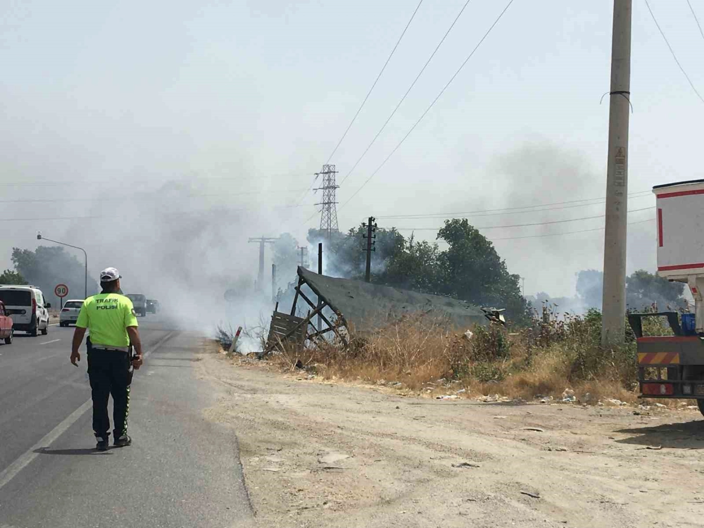 Yangın, Aydın-Denizli karayolu üzerinde bulunan Serçeköy kavşağı yakınlarında henüz belirlenemeyen bir nedenle yol kenarında çıktı. Rüzgarın etkisi ile alevler, bir anda geniş alana yayıldı. Yangın Aydın Valiliği Yatırım İzleme Koordinasyonu Başkanlığı(YİKOB) ait depoların bulunduğu alana sıçradı. İhbar üzerine olay yerine çık sayıda itfaiye, polis ve jandarma ekipleri sevk edildi. Polis, yangın nedeniyle Aydın-Denizli karayolunu kaplayan dumanlardan dolayı trafik akışını kontrollü sağlarken itfaiye ekipleri alevlere müdahale etti. Elektrik dağıtım şirketi ekipleri ise bölgedeki direklere çıkıp elektrik akımını kesti. Alevler depolara sıçramadan itfaiye ekipleri tarafından söndürüldü. Yangında yol kenarında bulunan direkler zarar gördü. Aydın-Denizli karayolunda uzun araç kuyruğu oluştu.