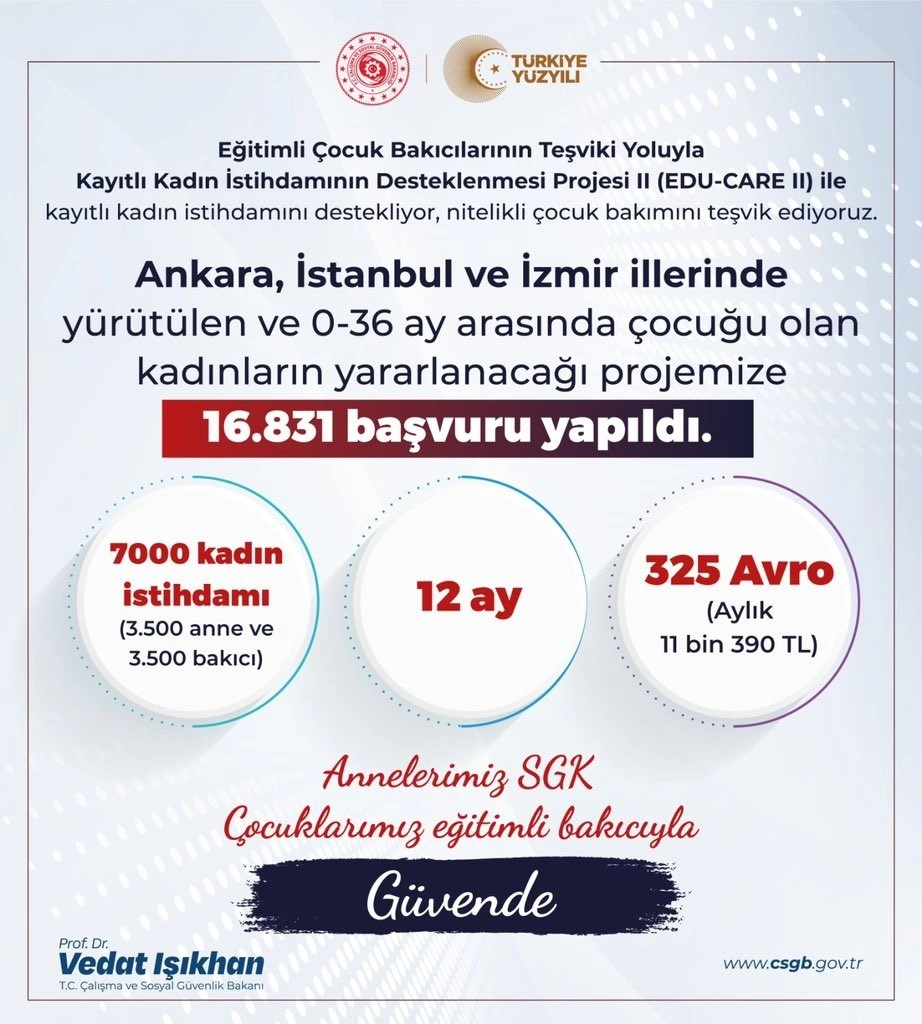 Çalışma ve Sosyal Güvenlik Bakanı Vedat Işıkhan, Ankara, İstanbul ve İzmir illerinde yürütülen ve 0-36 ay arasında çocuğu olan kadınların yararlanacağı Eğitimli Çocuk Bakıcılarının Teşviki Yoluyla Kayıtlı Kadın İstihdamının Desteklenmesi Projesi II’ye (EDU-CARE II) 16 bin 831 başvuru yapıldığını bildirdi.