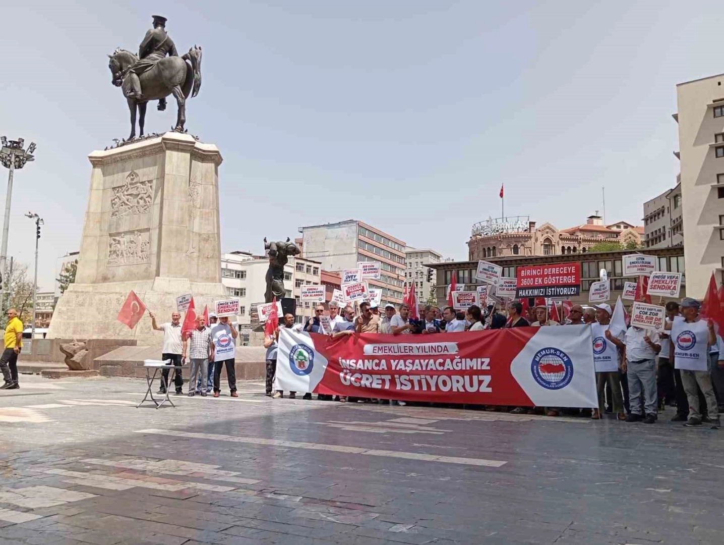 Memur-Sen Konfederasyonuna bağlı faaliyetlerini sürdüren Emekli Memur-Sen bugün açıklanan enflasyon verilerinin ardından emeklilerin talep ve beklentilerini kamuoyu ile paylaşmak amacıyla basın açıklaması düzenledi. Ankara Ulus Meydanı’ndan gerçekleştirilen basın açıklamasında konuşan Emekli Memur-Sen Başkanı Ali Küçükkösen, açıklanan haziran ayı enflasyon rakamlarıyla birlikte işçi ve Bağ-Kur emeklilerinin aylıklarında yüzde 24,73, memur ve memur emeklilerinin aylıklarında ise yüzde 19,31 zam yapılacağını hatırlattı. Küçükkösen, 2023 Temmuz ayında yapılan seyyanen iyileştirmenin kamu görevlisi emeklilerine yansıtılmadığını belirterek, kamu emeklilerinin bu nedenle 6 aylık gelir kaybı yaşadığını savundu.