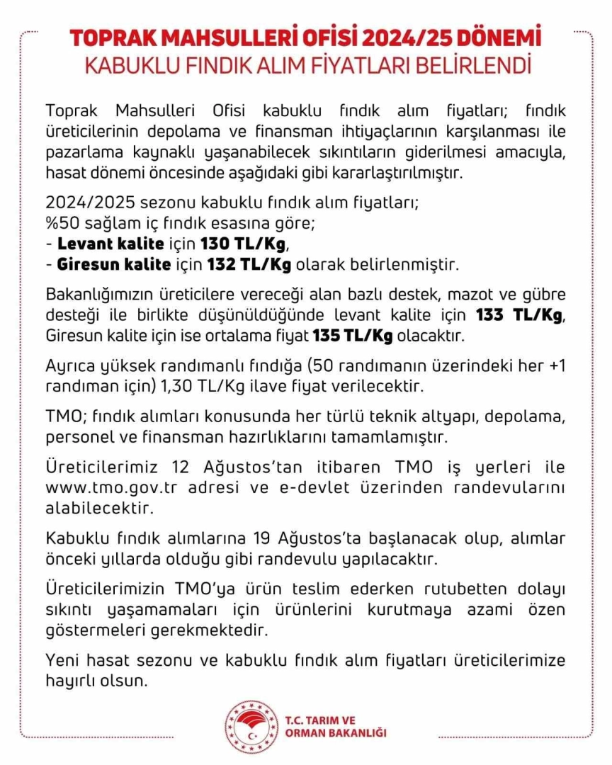 Tarım ve Orman Bakanlığından yapılan yazılı açıklamada, "2024/2025 sezonu kabuklu fındık alım fiyatları yüzde 50 sağlam iç fındık esasına göre; Levant kalite için 130TL/Kg, Giresun kalite için 132TL/Kg olarak belirlenmiştir" denildi.