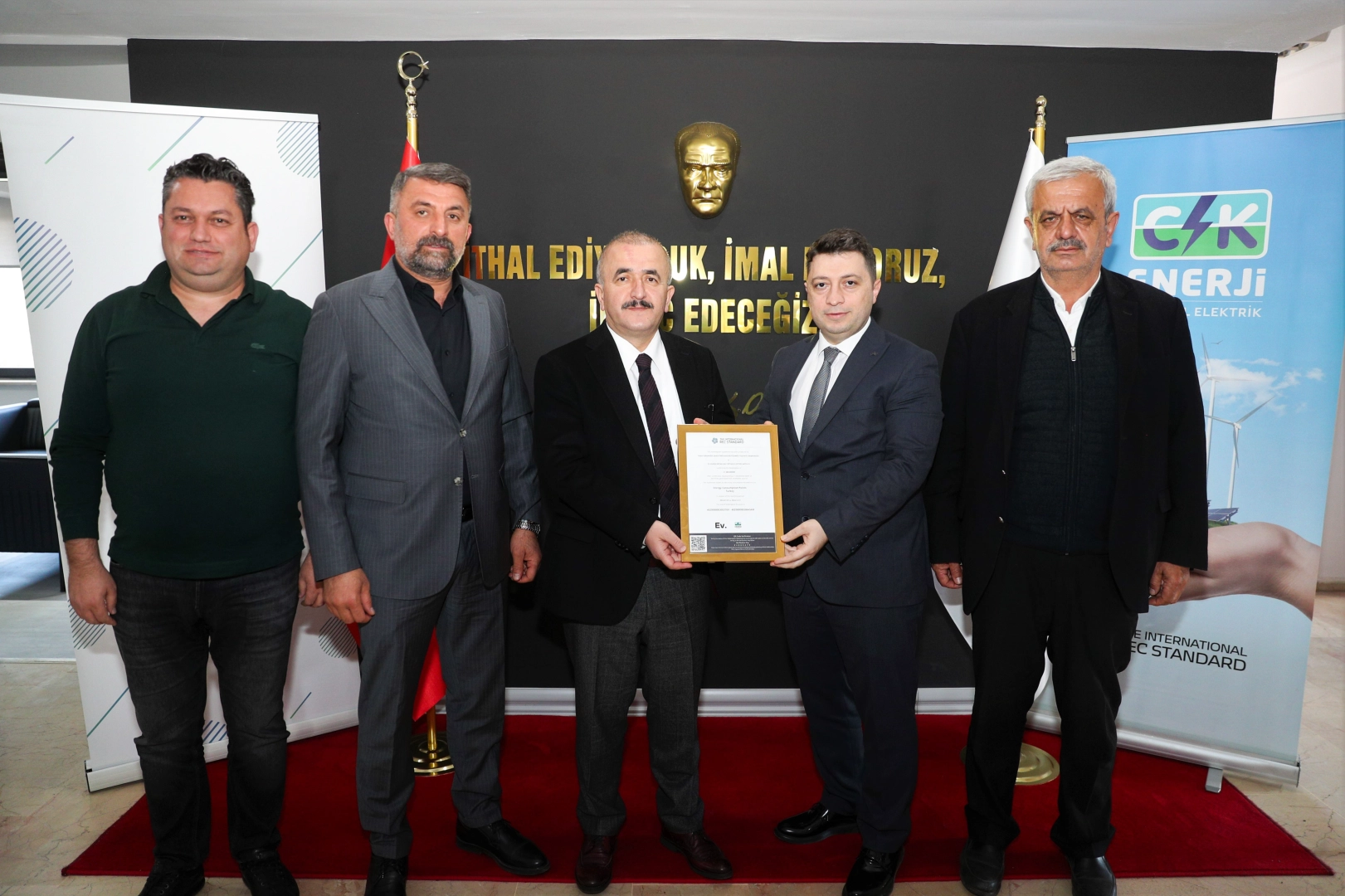 Tokat OSB Müdürlüğünde gerçekleştirilen I-REC sertifikası teslim töreninde, CK Enerji Çamlıbel Elektrik Genel Müdürü Muharrem Bülbül, Tokat Valisi ve aynı zamanda Tokat OSB Yönetim Kurulu Başkanı da olan Numan Hatipoğlu’na, Tokat OSB Yönetim Kurulu Üyeleri adına I-REC sertifikasını takdim etti.