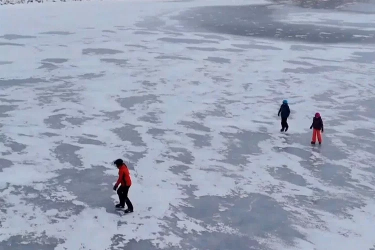 In Erzincan's Ergan Ski Resort, Ardıçlı Lake, covered with ice due to the cold weather, saw some citizens enjoying ice skating. In the city where the temperature dropped to as low as minus 10 degrees Celsius in higher altitudes, the surface of Ardıçlı Lake, located at the Ergan Mountain Winter Sports and Nature Tourism Center, froze. The frozen lake and its surroundings created a beautiful landscape. On the surface of the lake, covered with ice and having a depth of 5 meters, some citizens had fun by ice skating.