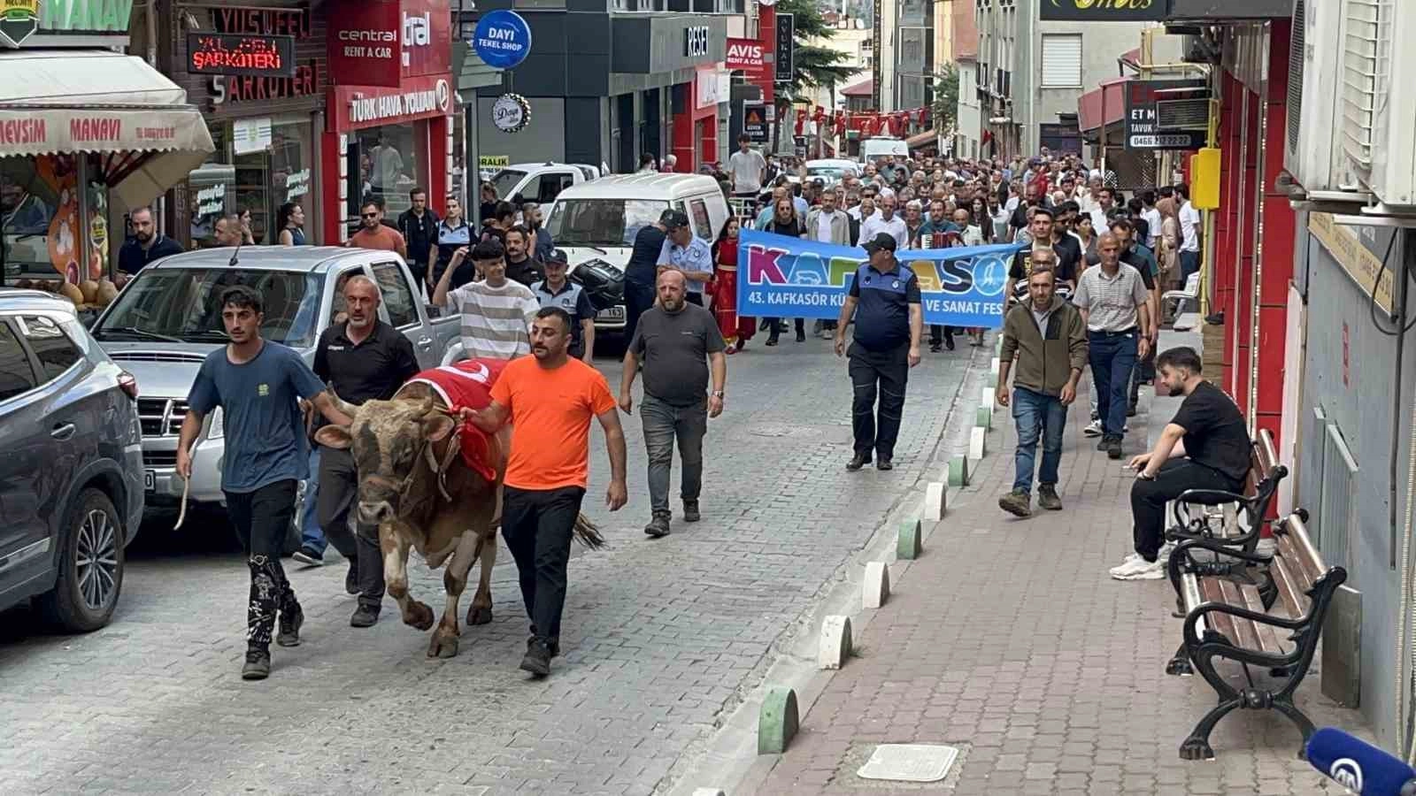 Artvin’de bu yıl 43.’sü düzenlenen Kafkasör Kültür Turizm ve Sanat Festivali kortej yürüyüşüyle başladı. Festivalin en önemli organizasyonu olan ve 200 yıllık bir geleneğe sahip boğa güreşleri nedeniyle kortejde güreş boğaları da yerini aldı. Kortej yürüyüşü, ’Ahmetağa’ isimli 700 kilo ağırlığındaki boğanın üzerine örtülen Türk bayrağı eşliğinde gerçekleşti. Belediye binası önünde toplanan vatandaşlar, Valilik önündeki Atatürk Anıtı’na çelenk bıraktı. Ardından saygı duruşunda bulunularak İstiklal Marşı okundu.