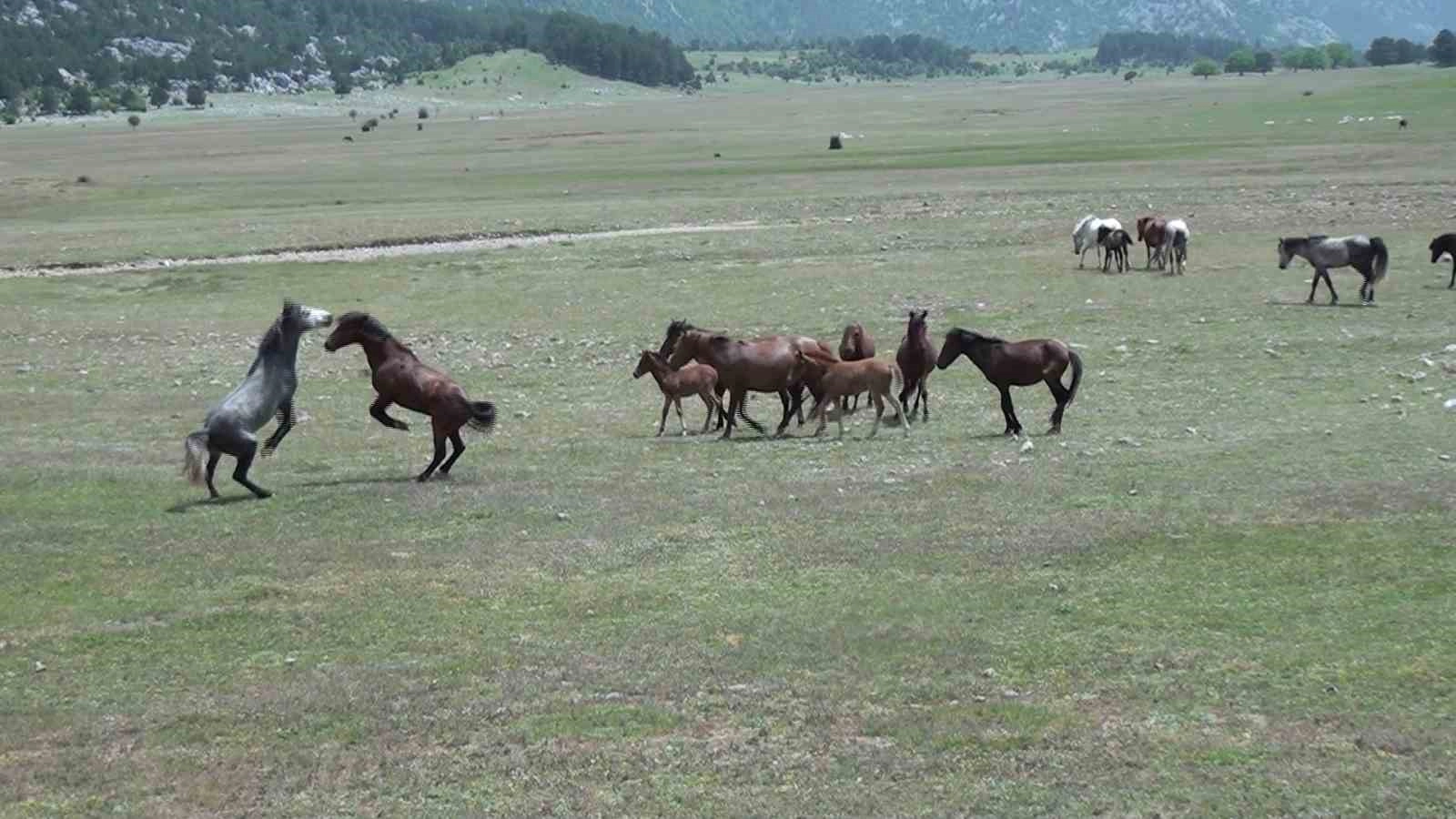 Antalya’nın İbradı ilçesi Ormana Mahallesi sınırlarında bulunan “Eynif Ovası”nın en önemli değerlerinden olan ve 90 bin dönümlük düz ovada yavrularıyla birlikte özgürlüğün tadını çıkartan Yılkı atları karadan ve havadan görüntülendi.