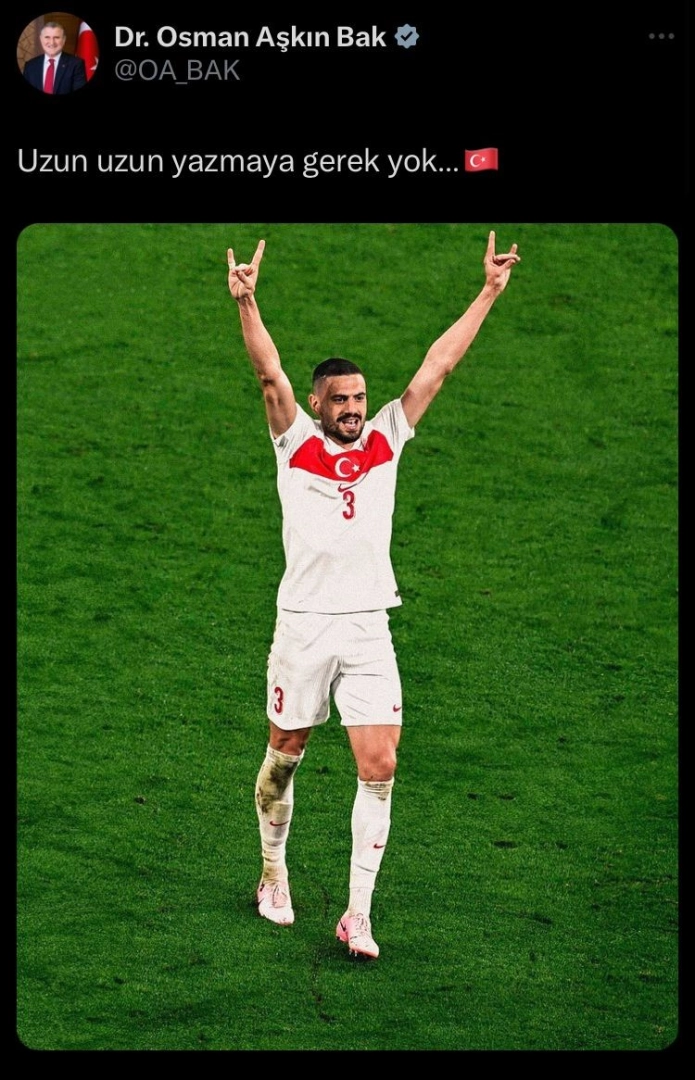 Gençlik ve Spor Bakanı Osman Aşkın Bak, sosyal medya hesabından milli futbolcu Merih Demiral’a destek paylaşımında bulundu.