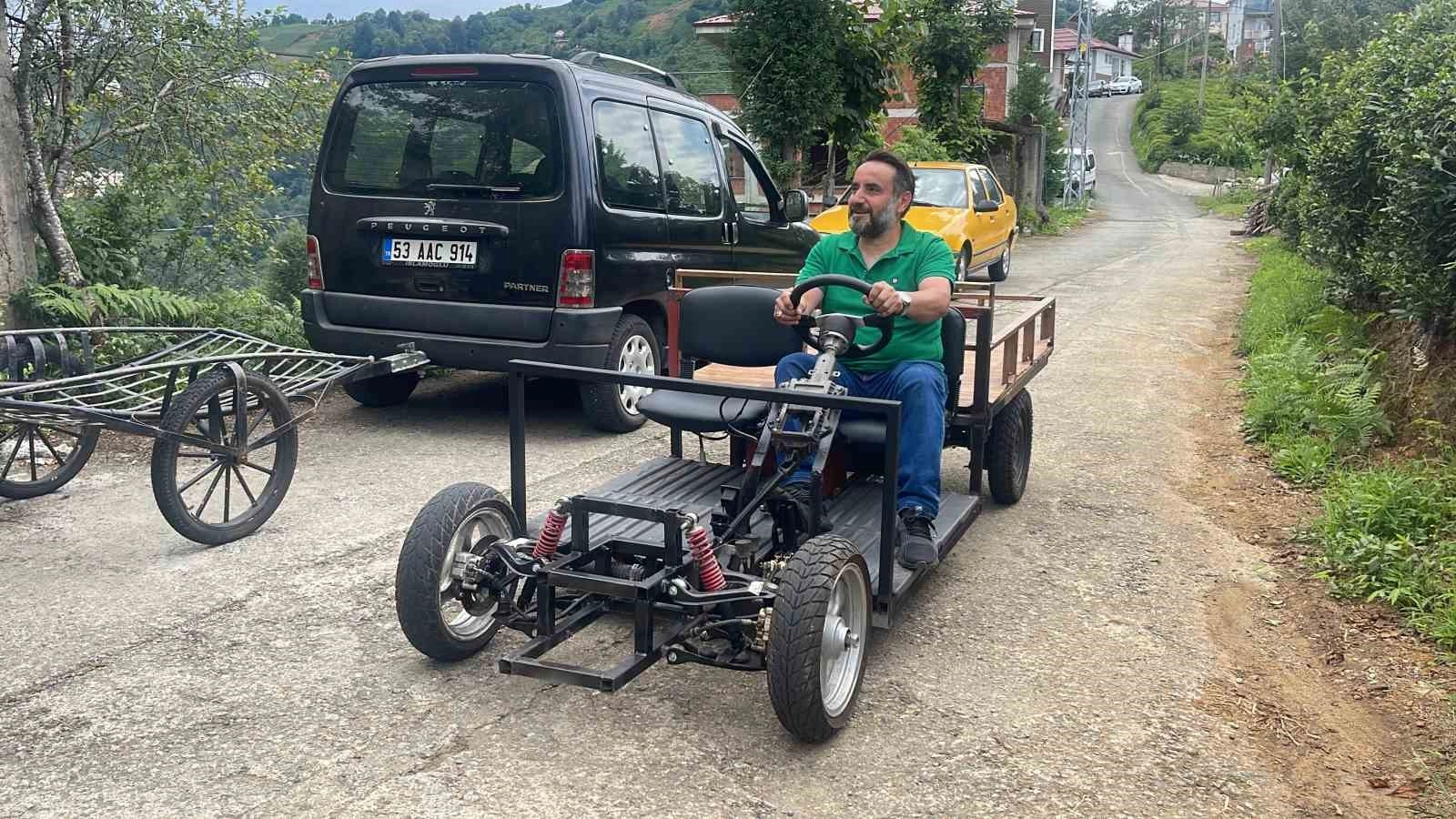 Rizeli Bayram Kar, köyde daha rahat ve masrafsız bir şekilde çay taşıyabilmek için elektrikli araç yaptı.
