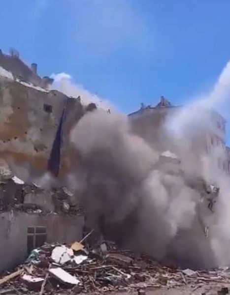 Kahramanmaraş’ta 6 Şubat 2023’te meydana gelen yıkıcı depremlerden etkilenen Elazığ’da ağır hasarlı binaların yıkımı devam ediyor. Bu çerçevede Üniversite Mahallesinde yıkımına başlanan 3 katlı bina, iş makinesinin vurmasıyla bir anda yerle bir oldu. O anlar ise cep telefonu kamerası ile kaydedildi.