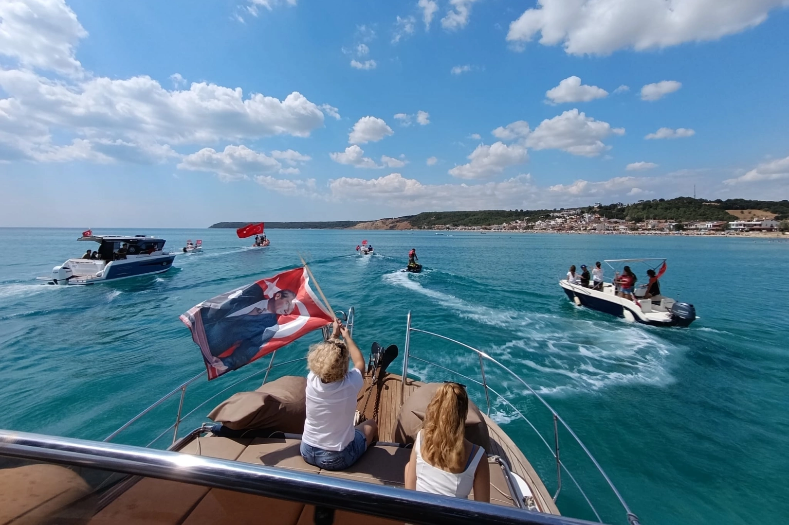 Erdoğan DEMİR / EDİRNE (İGFA) - Saat 13.30’da Vali Konağı önünde geçen tekneler, sahilde toplanan vatandaşlar tarafından ellerindeki bayraklarla selamlanarak 30 Ağustos Zafer Bayramı’nın coşkusu yaşatıldı.