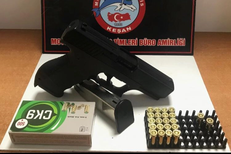 durumundan şüphelenilen 22 A.. 8.. plaka sayılı araçta yapılan kontrollerde 1 adet kurusıkı tabanca ve bu tabancaya ait 22 adet fişek ele geçirildi.