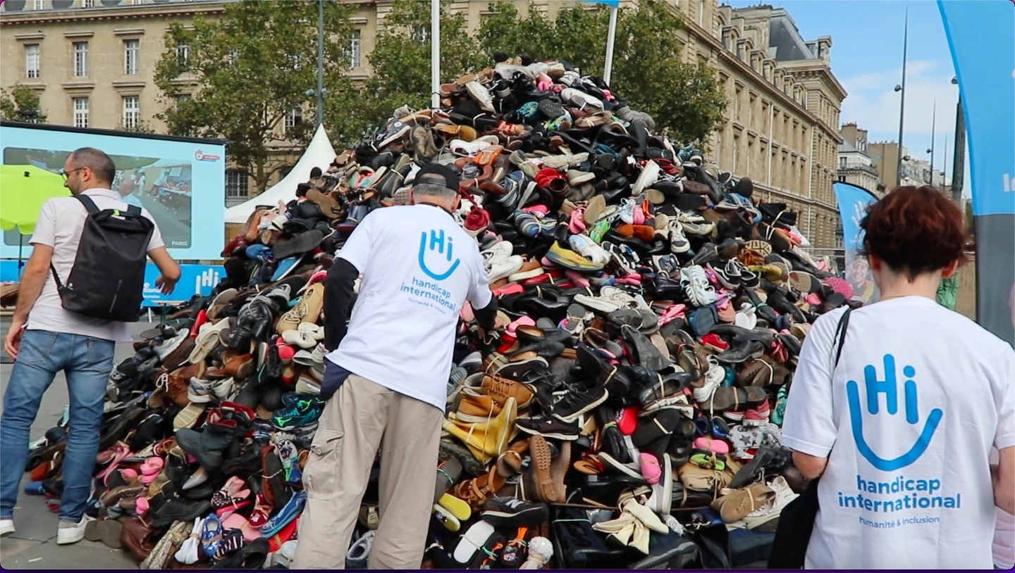 Uluslararası sivil toplum kuruluşu Handicap International, Fransa’nın başkenti Paris’te mayın ve bombalar nedeniyle uzuvlarını kaybedenlere destek gösterisi düzenledi. Handicap International, İsrail’in saldırıları nedeniyle geçen sene uzuvlarını kaybederek sakat kalan sivillerin sayısının yüzde 130 arttığını belirtti. Republique Meydanı’nda 30’uncusu düzenlenen gösteride katılımcılar, her bir ayakkabının mayın ve bombalar nedeniyle ölen ya da yaralanan sivilleri temsil ettiği ayakkabılardan oluşan bir piramit yaptı. Mayın ve bombalar nedeniyle sakat kalan çocukların ve yetişkinlerin heykelleri ile saldırılar sonucu yıkılan binaların enkaz parçalarının sergilendiği eylemde, yerinden edilen aileleri temsilen çadırlar kuruldu.