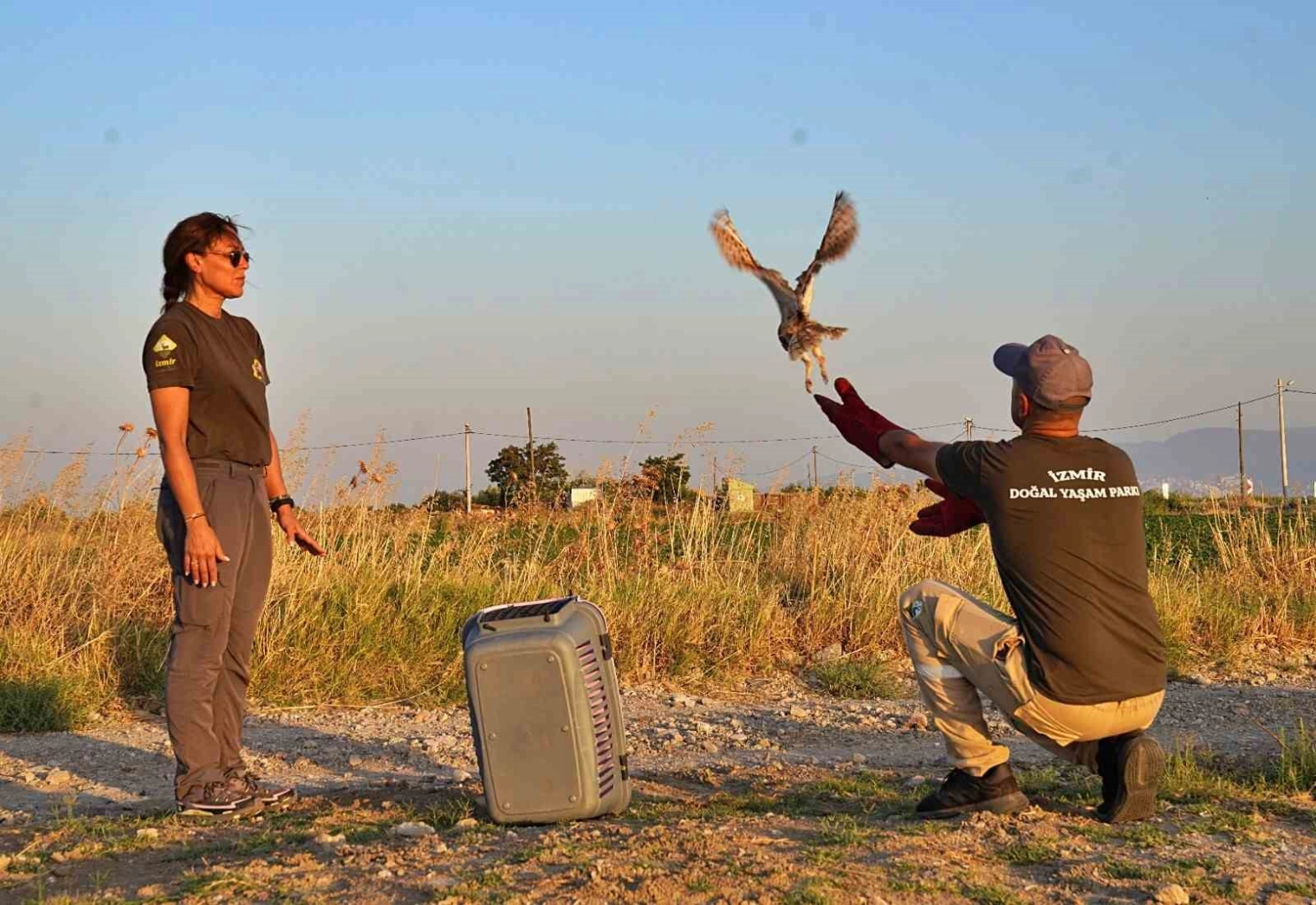 Taşıma kafesine konularak Menemen Tuzçullu Mahallesi yakınlarına getirilen baykuşlar günbatımında doğaya bırakıldı.