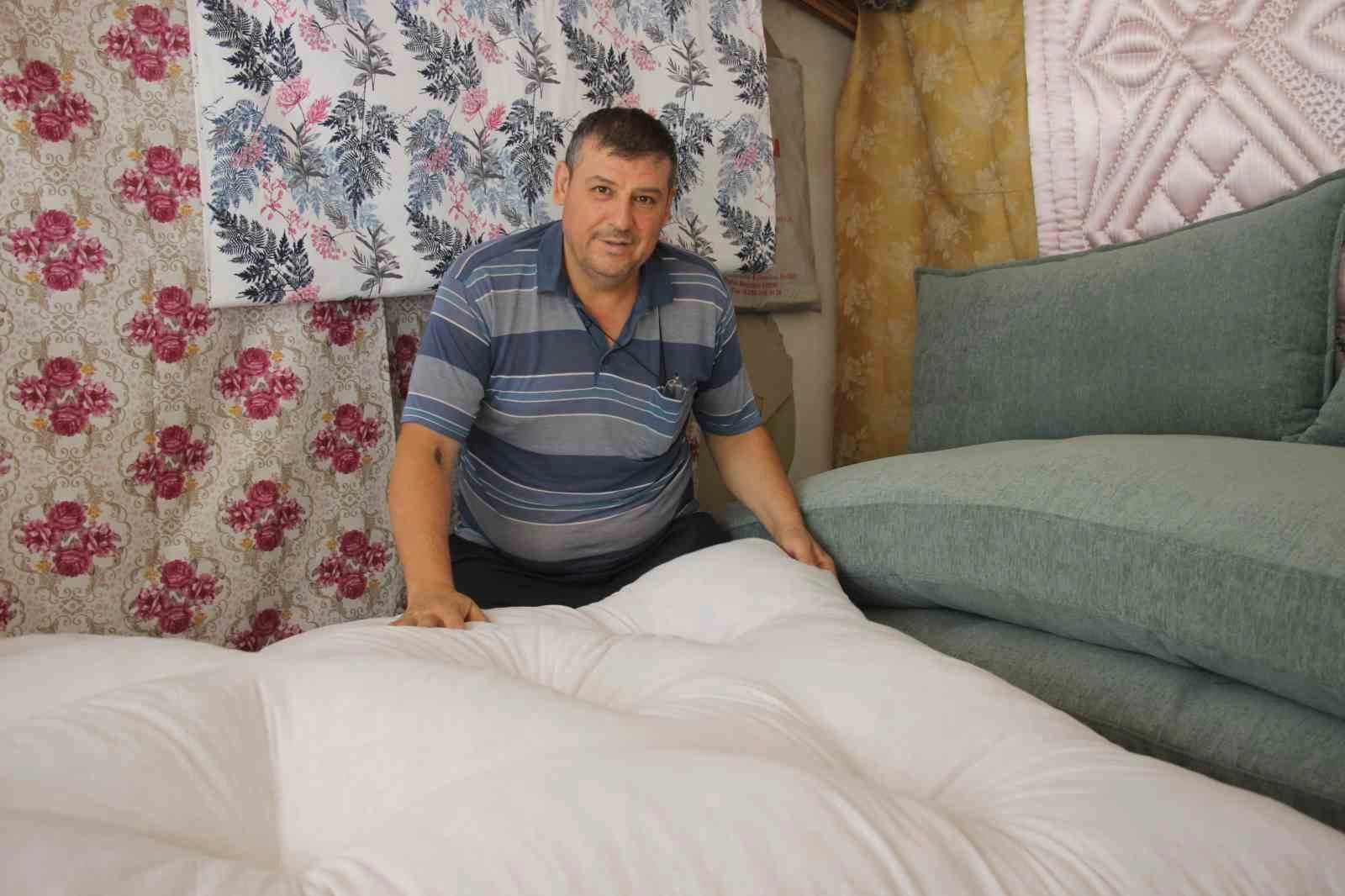 Pamuk yatak ve yorganların ağırlığının insanları zorladığını belirten Zeytindalı, "Artık pamukları az kullanıp aynı elyaf yorgan gibi daha ince yorganlar dikiyoruz. Yatakların üzerine şilte yapıyoruz. Sünger ile teması kesmek için, kaldırıp koyması daha kolay olsun diye böyle ürünler hazırlıyoruz. Pamuk yatak yorganı ağır olduğu için tercih etmediklerinden dolayı bunu inceltip o şekilde yapıyoruz. Bu tarz ince dikimler, yatakların üzerine koyup yatmak için daha rahat ve sağlıklı. Normal kullanmak için de ince yatak yapabiliriz, daha çabuk basılır. Basılsa da her şeyden daha sağlıklı olduğu için buna değer bence. Çekyatlar da olsa oturma grupları da olsa hepsi sünger. Onların üzerlerine de sünger ile teması kesmek ve yatmak için kullanmak için yapılıyor" ifadelerini kullandı.