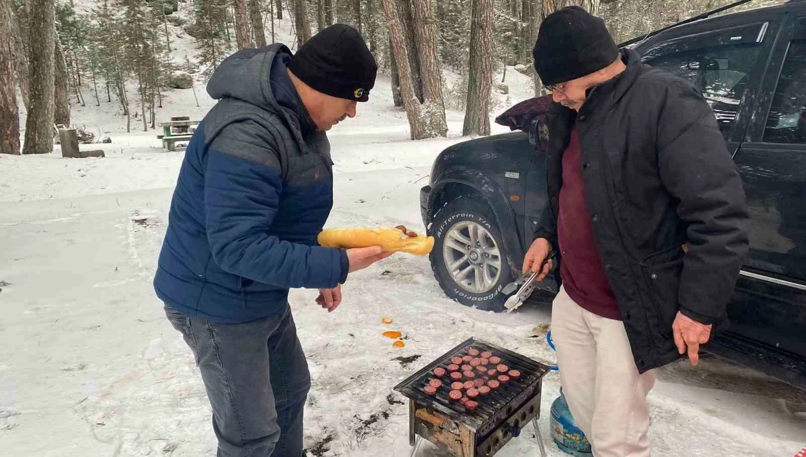 Kütahya’nın Simav ilçesine 16, Hisarcık ilçesine 24 kilometre uzaklıkta bulunan, asırlık çam ormanlarıyla saklı Simav Gölcük Yaylasının karla kaplı zemininde vatandaşlar piknik yapıp mangal keyfi yaşıyor.