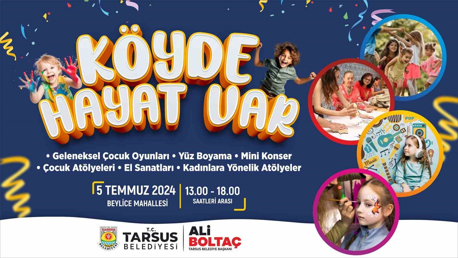 Tarsus Belediyesi Kültür ve Sosyal İşler Müdürlüğü ile Kadın ve Aile Hizmetleri Müdürlüğü koordinesinde, kırsal mahallelerde çocukların keyifli vakit geçirmesi amacıyla ’Köyde hayat var’ şenlikleri düzenlenecek. Yaz tatilinde çocukları mutlu edecek rengarenk içeriklerle dolu olan şenlikler, geleneksel çocuk oyunları, yüz boyama, mini konser, çocuk atölyeleri, el sanatları ve kadınlara yönelik atölyeler gibi çeşitli etkinlikleri içeriyor. Etkinlikte hem çocuklar hem de aileler keyifli vakit geçirecek.