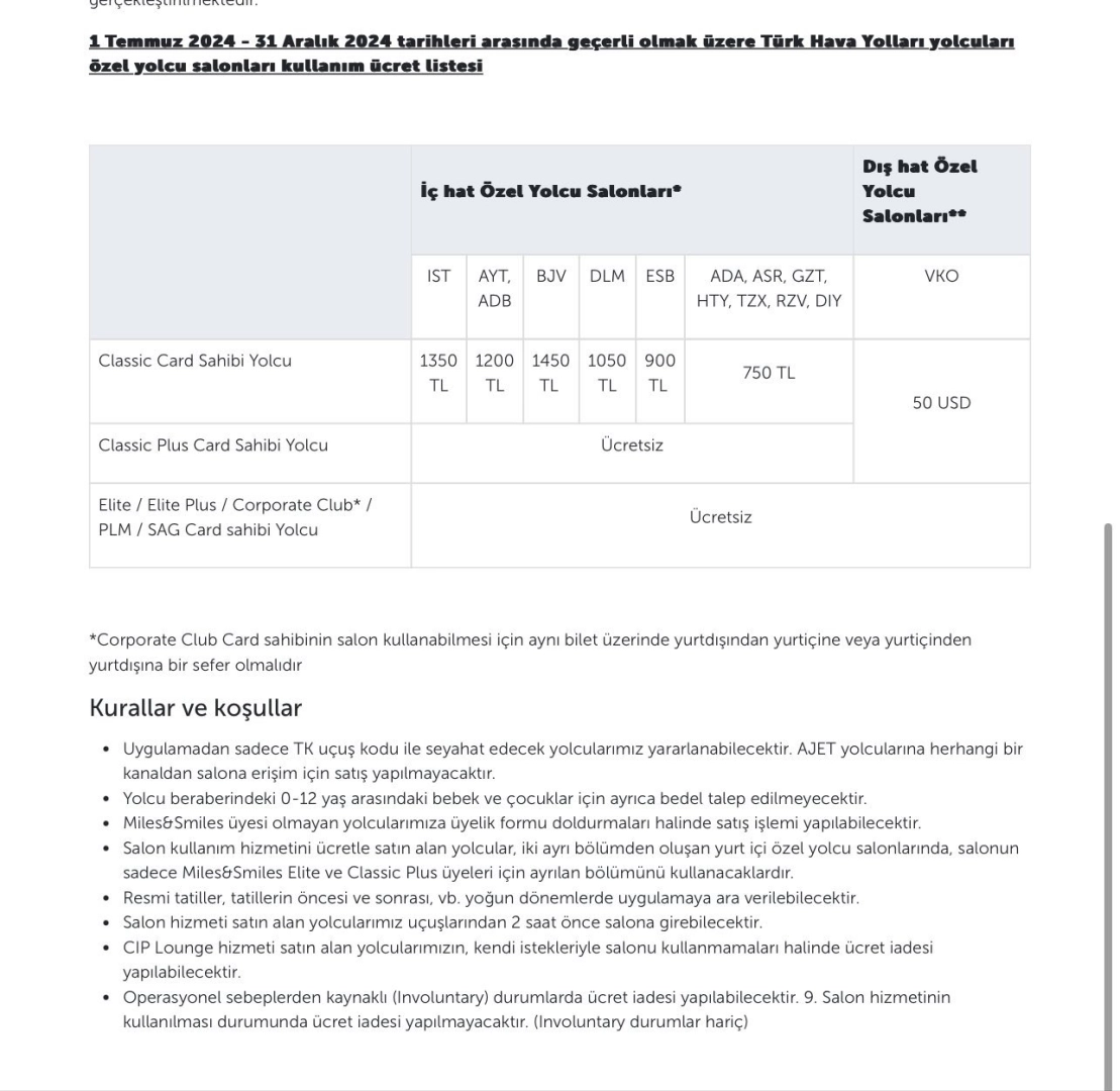 Türk Hava Yolları yaklaşık altı ayda bir özel yolcu salonlarına zam yapıyor. THY’nin, özel yolcu salonlarını kullanma ücretlerine yaptığı zamlar 1 Temmuz - 31 Aralık 2024 arasında geçerli olacak ve yeni yılda yeniden zamlanacak.