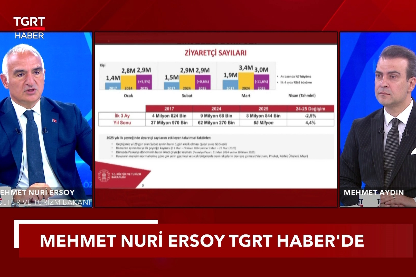 Kültür ve Turizm Bakanı Mehmet Nuri Ersoy TGRT Haber ekranlarında yaptığı açıklamada, 2024 yılının 61,1 milyar dolarlık turizm geliri ve 62,3 milyon ziyaretçi sayısıyla tamamlandığını belirterek, "Bu sene 64 milyar dolar gelir hedefliyoruz. Hem geceleme hem de gelen turistin sayısının tespiti konusunda en iyileri şu anda Türkiye. Sağlık turizminde 3 milyar dolardan fazla bir gelir elde ettik" dedi. Kültür ve Turizm Bakanı Mehmet Nuri Ersoy, TGRT Haber ekranlarında "Gündem Özel" programında Mehmet Aydın'ın sorularını yanıtladı. Türkiye'nin 2024 turizm performansını değerlendiren Bakan Ersoy, 2025 hedefleri ve kültür politikalarına ilişkin bilgiler verdi. Bakan Ersoy, 2024 yılının 61,1 milyar dolarlık turizm geliri ve 62,3 milyon ziyaretçi sayısıyla tamamlandığını aktararak 2025 yılı turizm geliri hedefinin 64 milyar dolar olduğunu ifade etti. "Bu sene 64 milyar dolar gelir hedefliyoruz" 2025 yılı için hedeflerini de paylaşan Kültür ve Turizm Bakanı Mehmet Nuri Ersoy, "61,1 milyar dolar gelir, 62,3 milyon ziyaretçi sayısıyla 2024'ü kapattık. Turizm gelirlerinin her geçen gün ekonomideki payı artıyor. İnşallah bundan sonra da artık hedefleri artırarak devam etmemiz gerekiyor. Hedefin üstünde kapattık; hedef 60 milyon ziyaretçi, 60 milyar dolardı, o açıdan başarılı bir yıl. Türkiye gibi bir jeopolitik ortamda yer alıyorsanız her zaman anlık olumsuzluklara da hazırlıklı olmanız gerekiyor. Global olumsuzluklar da çok gelişmeye başladı; savaşlar, afetler, hareketlilikler, sıcak çatışma ortamlarının sayısı artmaya başladı. Dünyadaki bu değişime paralel bir şekilde biz buna hazırlanarak gelmiş olduk. Her seferinde yeni rekorlar getirerek yolumuza devam etmek istiyoruz. Bu sene 64 milyar dolar gelir hedefliyoruz. Yıl ortalamasına baktığınız zaman yüzde 4,4'lük gelirde artış öngörüyoruz. İlk 3 aylık veriler, baktığınız zaman hedefin üzerinde gerçekleşti. 9,5 milyar dolarla kapattık, yüzde 5,6 artış oldu. İlk çeyrekte bir sürü takvimsel olumsuz etki vardı. Mesela ocak ayında ziyaretçi sayısında iyi bir büyüme yaptık. Aşama aşama yukarı çıkmaya başladık. 2024'te Dünya Turizm Örgütü'nün açıkladığı verilere göre Türkiye, ziyaretçi sayısı olarak 4'üncü sıraya geldi. Bizim nihai hedefimiz; ilk 3'e girmek, tabi bu kolay bir süreç değil. 20 milyon kadar bir fark var, çok detaylı hazırlanmak gerekiyor. Yasalarda bazı değişiklikler yaparak bütün otellerin Bakanlıktan belge almasını mecburi hale getirdik, bakanlık tarafından takip edilebilir hale geldiler. Bütün otellerin standartları, kriterleri tek elden denetlenebiliyor. Sertifikasyon programlarını devreye soktuk" dedi. "Hem geceleme hem de gelen turistin sayısının tespiti konusunda en iyileri şu anda Türkiye" Türkiye'nin sürdürülebilir turizmde öncü olduğunu belirten Bakan Ersoy, 42 kriterlik bir yapı oluşturduklarını, 2030 yılına kadar tüm tesislerin bu standartlara ulaşmasını hedeflediklerini söyledi. Sözlerini sürdüren Bakan Ersoy, "Biz turizme daha geç girdik, eskiden Türkiye'de turizm dediğiniz zaman sadece deniz, kum, güneş akla gelirdi. Halbuki Türkiye'nin o kadar büyük potansiyeli var ki. Üçüncülüğe gelmek istiyorsak turizmi sadece deniz, kum, güneşten çıkartmamız gerekiyor ki çıkartmaya başladık. Ürün çeşitliliğini artırdığınız zaman 81 vilayete yayma şansını yakalıyorsunuz. İstanbul, Antalya, Ege ile sınırlı kalmıyor, ikincisi 12 aya yayma şansını yakalıyorsunuz. Turizmin sezonluk olmaması lazım, mümkünse 12 ay olması gerek. Uluslararası sertifikasyonlara ve standartlara bütün konaklama tesislerinizin sahip olması gerekiyor. Giriş yapan turistin tamamı pasaport okutarak girer. Hem geceleme hem de gelen turistin sayısının tespiti konusunda en iyileri şu anda Türkiye çünkü hepsi sayılıyor. Avrupa Birliği'nde öyle olmuyor. Geçen sene yabancı turistten elde edilen gecelik gelir 108 dolara çıktı, bu seneki hedefimiz 117 dolar. Kişi başı gecelik gelirde hedefin üzerinde gidiyoruz, bu iyi bir şey" diye konuştu. "Sağlık turizminde 3 milyar dolardan fazla bir gelir elde ettik" Sağlık Bakanlığı ile Kültür ve Turizm Bakanlığı arasında imzalanan Uluslararası Sağlık Turizmi Alanında İşbirliği Protokolüne ilişkin konuşan Bakan Ersoy, "Sağlık turizmi; geçen gün Sağlık Bakanımızla bir protokol imzaladık. Her şeyin başı denetim ve standart. Sağlık amaçlı Türkiye'ye gelenler turist var bir de gelen turistin sağlığı var. Turistle muhatap olan hastanelerin belli bir sertifikasyona tabi olması sağlanacak. Sağlık Bakanlığı hem bu hastaneleri ayrıca denetleyecek hem de turistin yaptığı işlemleri de E-nabız sisteminde takip edilebilir hale getireceğiz. Sağlık Bakanlığı bu çalışmayı yapıyor, bu çok çok önemli. Turist hangi sağlık hizmetlerini almış, hangi fiyat politikalarıyla almış çok rahat bir şekilde göreceğiz. Turistin de sağlığını takip ediyor olacağız. Geçen sene çok ciddi sayıda turist aldık, sağlık turizminde 3 milyar dolardan fazla da bir gelir elde ettik. Sağlık alt yapımız çok iyi, pandemi sürecinde bu zaten kanıtlandı. Turizm Tanıtım ve Geliştirme Ajansı'nı getirmekte maalesef Türkiye olarak çok geç kaldık. Biz 2019'da kurduk, Türkiye şu an 200'e yakın ülkede en etkili ve yoğun tanıtım yapan ülke. Birkaç sene içinde bu üstünlüğü Türkiye ele geçirdi, her ülkeye göre ayrı tanıtımlar görüyorsunuz. O ülkeye hitap eden ürünlerle tanıtım yapıyorsunuz. ABD seçimlerinde Trump-Biden tartışma programında, tam ortasında Türkiye reklamı olmuştu, ABD'de sosyal medyada bile kazananı Türkiye diye insanlar yorumlar yapmıştı. 100'e yakın ürün çeşidi var, şu anda 60'ını öne çıkardık GoTürkiye sitesiyle. 