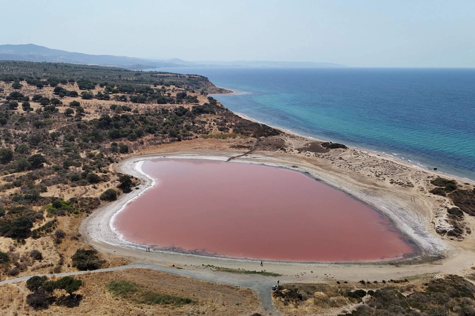 Çanakkale'nin Ezine ilçesine bağlı Dalyan köyündeki Alexandria Troas Antik Kenti'nin 2 bin yıllık iç limanı, zamanla denizle bağlantısı kesilince, doğa şartlarına bağlı olarak kalp şeklini aldı. İçerisindeki tuzlu su da yılın belli dönemlerinde pembe renge dönüşünce ortaya kalpli pembe göl çıktı. Bugünlerde yeniden pembeleşmeye başlayan kalp şeklindeki göl, ziyaretçilerin ilgisini çekiyor. Pembeye bürünen ve kalp şekli ile dikkati çeken 'Kalpli Göl', drone ile havadan görüntülendi. Kalpli göl doğal dokusu bozulmaması ve zarar görmemesi için araç trafiğine kapatıldı. Ziyaretçiler yaya olarak gölün olduğu alanı gezebilecek. Alexandria Troas Antik Kenti'nin ticaret merkezi olarak uzun süre hizmet eden 2 bin yıllık iç limanı, günümüzde ise kalpli pembe göl olarak turizme katkı sağlıyor. Dış liman ile bağlantısı zamanla ortadan kalkan antik kentin iç limanı bir göle dönüştü. Sıcaklık ve tuzluluğun artmasından dolayı 'dunaliella salina' adlı mikroskobik bitkisel canlının fazla üremesinden kaynaklı yaşanan pembe ve kırmızıya yakın tonlar, göle farklı bir görünüm kazandırıyor. Zamanla da doğa şartlarına bağlı olarak suyun çekilmesi ile kalp şeklini aldı. İçerisindeki tuzlu suyun yılın belli dönemlerinde pembe renge bürünmesiyle 2 bin yıllık antik liman, dünya üzerinde bilinen ve pembe renge sahip 8 gölden birisi haline geldi. Ziyaretçilerin çekip, sosyal medyada paylaştığı fotoğraflarla popülerliği artan kalp şeklindeki gölün suyu, bugünlerde yine pembeye çalmaya başladı. Pembeye bürünen ve kalp şekli ile dikkati çeken 'Kalpli Göl', drone ile havadan görüntülendi. Kalpli göl doğal dokusu bozulmaması ve zarar görmemesi için araç trafiğine kapatıldı. Ziyaretçiler yaya olarak gölün olduğu alanı gezebilecek. Ankara Üniversitesi Arkeoloji Bölümü Öğretim Üyesi Kazı Başkanı Prof. Dr. Erhan Öztepe, “Son belki beş yıldır Alexandria Troas Antik kentinin iç liman bölgesi olarak aslında teknik olarak karşılığı bu içinde hapsolmuş suyun nedeniyle kalpli göl yada pembe göl olarak toplum tarafından tanınan bölge ısı değişimleri ve burada hapsolmuş suyun içerisinde yaklaşık bin yılı aşkın süredir oluşan mikro klima, mikro iklim ve mikroorganizmalar nedeniyle renk değiştiriyor. Bu ısıya bağlı olarak mevsimsel değişimler olabiliyor. Genelde de işte Ağustos ayının ikinci yarısından Eylül ayının ortasına kadar olan dönemde bu tam yazdan sonbahara döndüğümüz dönemde bu ısı değişimleri çok net bir biçimde renk değişim olarak karşımıza çıkıyor. Bir de kıştan ilkbahara dönerken, renk değişimi tabii kalpli pembe göl bir şeker pembesi değil genelde buraya gelen ziyaretçilerimiz böyle gerçekten o şeker pembesi renginde tonunda bir renk bekliyorlar. Öyle bir renk değişimi değil bu daha kiremit kırmızısı rengi olarak adlandırabileceğimiz bir renk. Bu değişimi sağlayan hem bu suyun içerisinde oluşan bu mikroorganizmaların da oluşturduğu bir değişim ki, bu mikroorganizmalarla ilgili geçtiğimiz yıllarda Çanakkale Onsekiz Mart Üniversitesi Biyoloji bölümünden mikrobiyoloji üzerine çalışan uzmanların çalışmaları oldu. Burada daha önce tespit edilmemiş olan mikroorganizma boyutunda türlerin olabileceği ve bunların da belki çeşitli bilimsel çalışmalar neticesinde bir ihtimal bir yeni antibiyotik için kullanabileceğine dair veriler ortaya koyduğu meslektaşlar. Burayla ilgili bir düzenleme yapılması tabii ki bizim gündemimizde” dedi. Son yıllarda bu alanın popülaritesinin artmasıyla birlikte ziyaretçi sayısının fazlalaştığını da belirten Kazı Başkanı Prof. Dr. Erhan Öztepe, “Bunun kontrol edilebilir düzeyde olması çok önemli, çünkü bu özel bir alan. Şöyle söyleyeyim, yani mikrobiyologlarla yaptığımız değerlendirmelerde biyoloji bilimi açısından çevresiyle birlikte arkeolojik olarak kuşkusuz bir iç liman bölgesi olması anlamında değeri var ama biyoloji bilimi açısından da değeri var. Hatta böyle bir örnekleme ile bulun diğerinin bana anlattığı meslektaşlar dediler ki Salda Gölü ne kadar kendi has özel bir alansa buradaki bu renk değişimini sağlayan iç liman bölgesi ya da halkın tanıdığı ismiyle kalpli göl bölgesi o kadar değerli. Dolayısıyla buradaki turist sirkülasyonu düzenlemek gerekliliği ortaya çıktı. Biz şimdi bununla ilgili bir çalışma yapıyoruz. Bu yıl tabii çevremizde maalesef yaz başından beri yaşanan yangınlar sebebiyle bu alana trafik girişini kestik. Sadece yaya trafiği söz konusu, insanlar yaya olarak bu gölü gelip gezebilirler. Burası özel bir alan, bu alanı korumak hepimizin görevi. Lütfen ziyaretçilerimizden şunu rica ediyoruz, her zaman gelip gezebilirler bu alanı, alanın etrafında dolaşabilirler. Bu alanla ilgili bilgilendirme panoları hazırlanıyor. Onları da alana dikeceğiz. Bir düzenleme yapacağız. Ama sanıyorum bu tarihten sonra alan artık araç trafiğine açık olmayacak. Bu korumayı yapmak zorundayız. Araçlarıyla bir yere kadar gelip, yürüyerek alanı gezebilir. Ama gezdikleri süre boyunca alanı temiz tutulması, koruması bizim olduğumuz kadar ziyaretçilerin de sorumluluğunda, bu konuda onların desteğini bekliyoruz, her zaman bekliyoruz gelebilirler. Alanla ilgili olarak tabii entegre bir takım projelerimiz var. Alanı yukardan gören antik kentin Geç Akropoli diyebileceğimiz bölgede yer alan bir eski okul binası ve okul binasının merkezinde yer aldığı 2,5 dönüm bir arazide biz bir ziyaretçi bilgilendirme merkezi projesi hazırladık. Bu projesi proje onaylama aşamasında, bunu hayata geçirdiğimizde burası çok daha cazip bir noktaya gelecek ve entegre edeceğiz bunu iç liman, dış liman bölgesiyle, ziyaretçilerimizi bekliyoruz. Ama tekrar vurgula