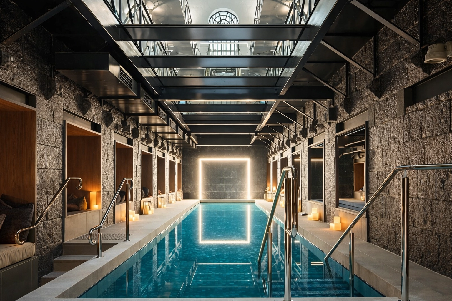 Otel, yer altındaki yüzme havuzunun merkezde olduğu tesisi, dünyada “hapishaneden dönüştürülmüş ilk kentsel wellness kaçamağı” olarak tanıtıyor.