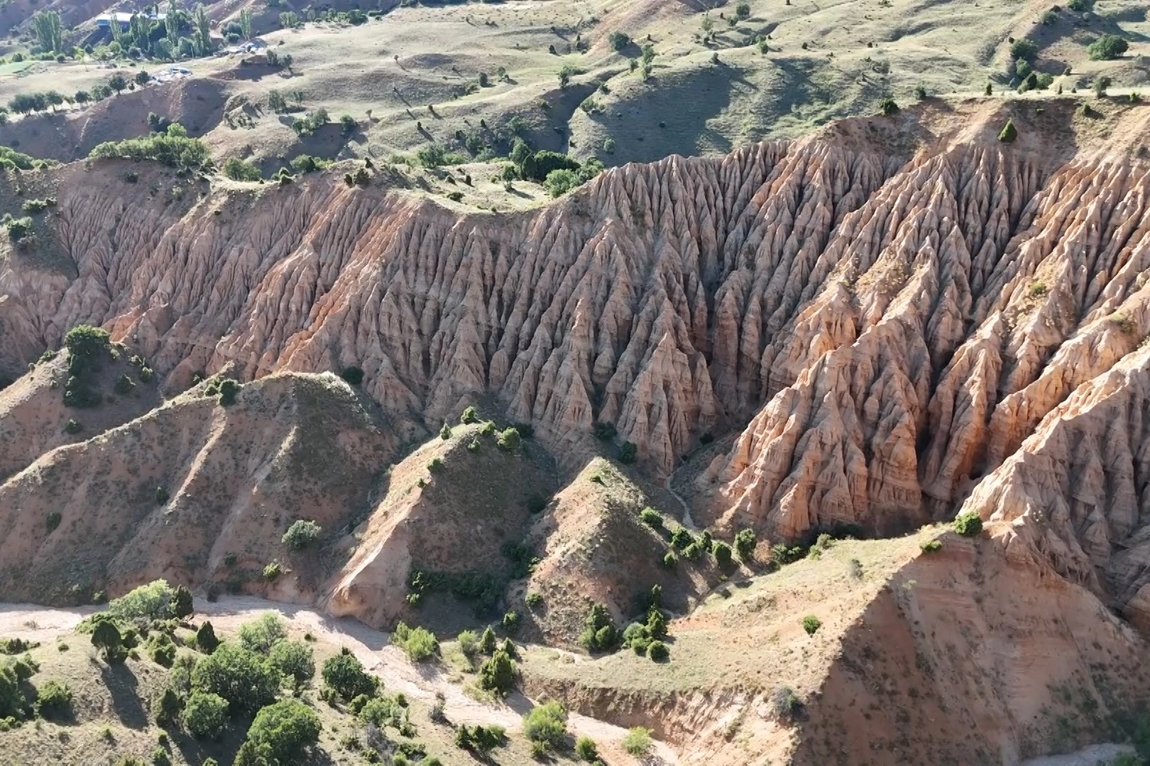Sivas'ın Divriği ilçesinde bulunan ‘Şeytan Şehri' olarak bilinen kayalıklar, binlerce yıllık doğal süreçler sonucu oluşan etkileyici yapısıyla doğaseverlerin ilgisini çekiyor. Sivas'ın Divriği ilçesine bağlı Maltepe köyüne 3 kilometre uzaklıkta bulunan Şeytan Şehri Kayalıklarının, yaklaşık 23 milyon yıl önce oluşan sedimanter kayaçların zamanla erozyon, yağmur ve sel sularıyla aşınması sonucu ortaya çıktığı düşünülüyor. Kum taşı yapısına sahip olan kayalıklar, zaman içinde insan ve hayvan figürlerine benzeyen şekiller oluşturdu. Güneşin batışı sırasında ortaya çıkan gölgeler ise bu figürleri daha belirgin hale getirerek, kayalıklara ‘Şeytan Kayalıkları' adının verilmesine neden oldu. Yaz aylarında özellikle doğa tutkunlarının ziyaret ettiği bölge, ay ışığının kayalıklara yansıması ve rüzgârın çıkardığı sesle birleşince yöre halkı tarafından ‘Şeytan Şehri' olarak adlandırılıyor. Her ne kadar ismi ürkütücü olsa da kayalıklar sahip olduğu farklı jeolojik yapısı, rengi ve asimetrik görünümüyle görenleri etkiliyor. Havadan da görüntülenen bu doğal mirasa olan ilgi ise her geçen gün artıyor. "Divriği'nin Şeytan Şehri, turizme kazandırılmalı" Bölgenin doğa turizmine kazandırılması gerektiğini vurgulayan yöre halkından Nuri Budak, "Divriği'de turizmin sadece Ulu Camii olarak algılanmaması gerekir. Divriği'nin doğal güzellikleri ve tarihi yapısı itibariyle de turizmin şehri olan bir ilçemizdir. Bu kayalıkların tanıtılması ve turizme kazandırılması ilçemize ekonomik olarak ekstra gelir sağlayacaktır. Umarım en kısa süre içerisinde memleketimize daha çok fayda sağlayabilmesi için yollar daha güzel yapılır. Peri Bacaları yani Şeytan Kayalıkları Sivas'ımız içinde ciddi bir potansiyel oluşturacaktır" dedi.