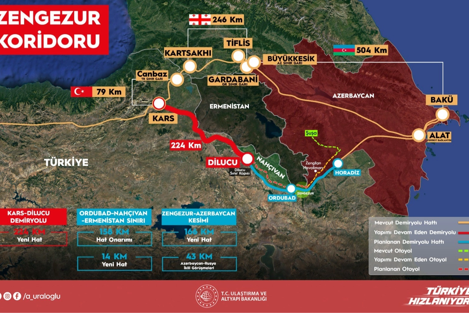 Ulaştırma ve Altyapı Bakanı Abdulkadir Uraloğlu, Kars-Iğdır-Aralık-Dilucu Demiryolu Hattı'nın temelinin 22 Ağustos Cuma günü atılacağını duyurdu. Bakan Uraloğlu, 224 kilometrelik hattın Zengezur Koridoru'nun önemli bir parçası olduğunu belirterek "Zengezur Koridoru'nun işlerlik kazanmasıyla birlikte Pekin'den Londra'ya kadar uzanan doğu-batı hattı daha verimli işleyecek" dedi. Ulaştırma ve Altyapı Bakanı Abdulkadir Uraloğlu, Türkiye'nin doğusunda yük ve yolcu taşımacılığını güçlendirecek Kars-Iğdır-Aralık-Dilucu Demiryolu Hattı'nın temelinin 22 Ağustos Cuma günü atılacağını duyurdu. Bakan Uraloğlu, hattın hem Türkiye'nin lojistik kapasitesini artıracağını hem de Asya'ya uzanan ticaret yollarında ülkenin jeostratejik güven adası olma özelliğini perçinleyeceğini söyledi. Yıllık 5,5 milyon yolcu, 15 milyon ton yük taşıma kapasitesi Hazine ve Maliye Bakanlığı tarafından yürütülen çalışmalar neticesinde proje için 2,4 milyar avroluk dış finansman sağlandığını hatırlatan Uraloğlu "Kars-Iğdır-Aralık-Dilucu Demiryolunu, 224 kilometre uzunluğunda, çift hatlı, elektrifikasyonlu ve sinyalizasyonlu inşa edeceğiz. Hattımız yılda 5,5 milyon yolcu ve 15 milyon ton yük taşıma kapasitesine sahip olacak. Projede 5 tünel, 19 aç-kapa tüneli, 3 viyadük, 10 köprü, 144 altgeçit, 27 üstgeçit ve 480 menfez yer alacak" açıklamasında bulundu. Zengezur Koridoru'nun önemli parçası olacak Temel atılacak hattın Azerbaycan ile Nahçıvan Özerk Cumhuriyeti arasındaki bağlantıyı sağlayacak Zengezur Koridoru'nun önemli bir parçası olduğunu belirten Uraloğlu, açıklamasında şu ifadelere yer verdi: "Bu hat sayesinde Türkiye ile Azerbaycan arasında kesintisiz yeni bir demiryolu bağlantısı daha sağlanacak. Aynı zamanda Doğu ve Güneydoğu Anadolu'nun üretim potansiyeli dış pazarlara daha hızlı ulaşacak, Akdeniz'in turizm potansiyeli artacak. Ayrıca bu hat; Trans-Hazar ve Kuzey-Güney koridorlarını güçlendirerek Avrasya'nın tedarik ve lojistik ağlarını kuvvetlendirecek, Türkiye'yi bölgesel işbirliğinin merkezine yerleştirecek. Güney Kafkasya'daki ekonomik işbirliğini artıracak Zengezur Koridoru'nun işlerlik kazanmasıyla birlikte Pekin'den Londra'ya kadar uzanan Doğu-Batı hattı daha verimli işleyecek. Orta Koridor'un demiryolu ve karayolu yük taşıma kapasitesi artacak."