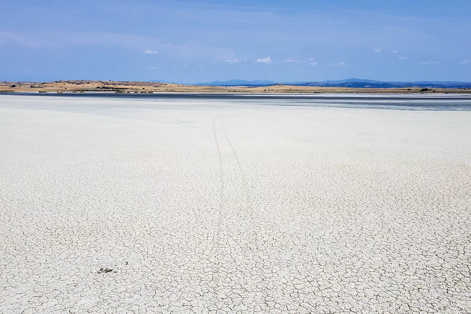 Yunanistan'ın çamur banyoları ile popülerleşen Picrolimni Gölü, bu yaz tamamen kuruyarak, bir arabayı taşıyabilecek kadar kuru bir zemin haline geldi.