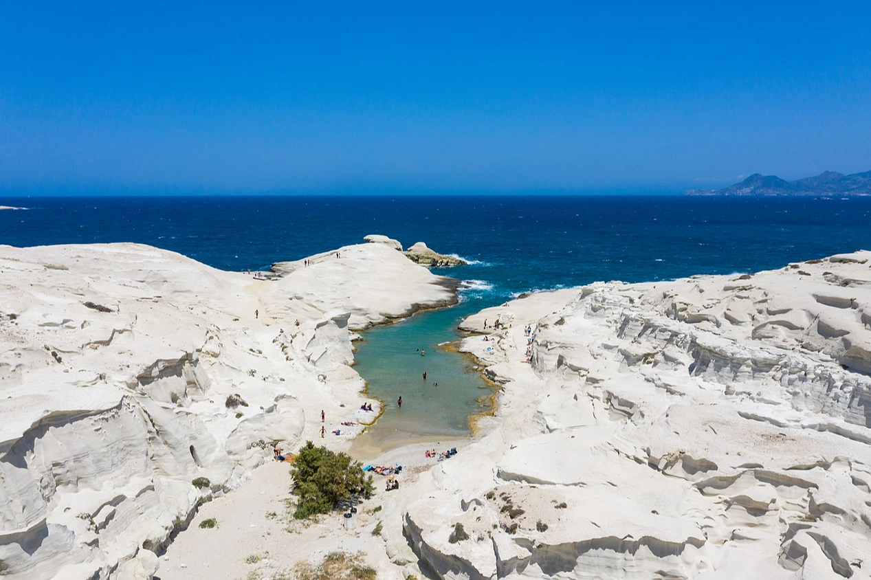 Yunanistan'ın Milos adasındaki Sarakiniko Plajı, Ay yüzeyini andıran görüntüsüyle dünya çapında ün kazanmış, benzersiz bir jeolojik oluşum olarak kabul ediliyor.