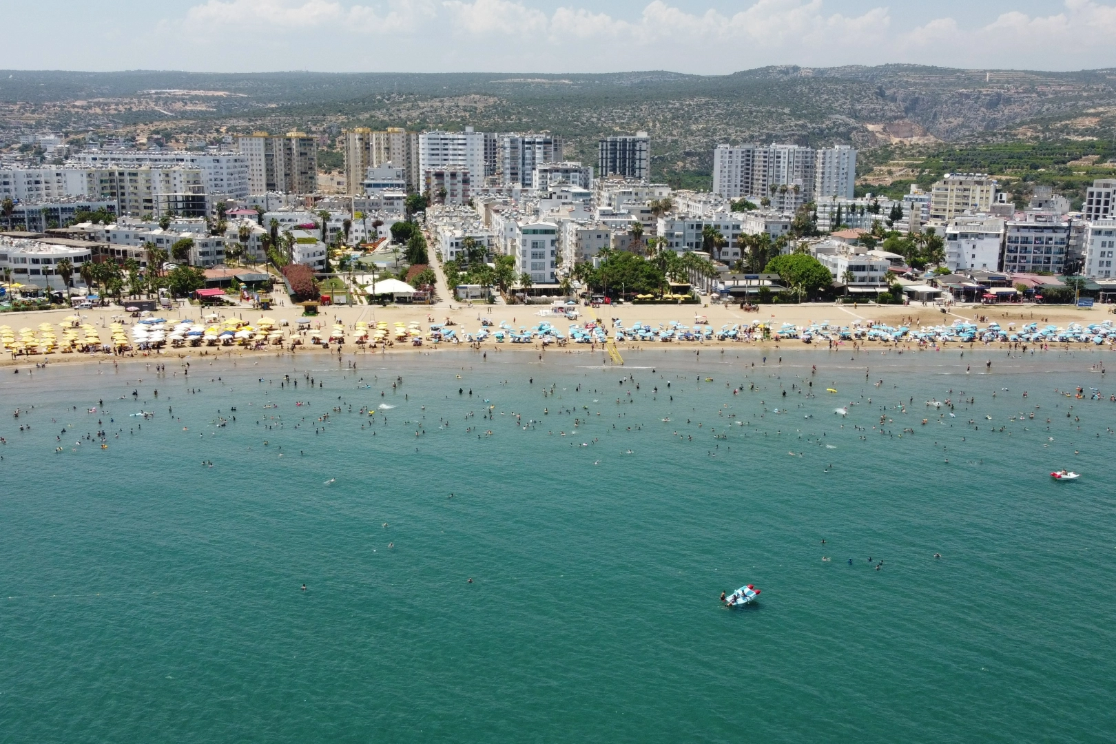 Все пляжи, особенно Кызкалеси, жемчужина Мерсина, одного из важных туристических центров Турции, были переполнены во время 9-дневного отпуска. В Мерсине, береговая линия которого простирается на 321 километр до Средиземного моря, пляжи были переполнены во время 9-дневного отпуска. Отдыхающие стекались на 11 пляжей, отмеченных голубым флагом, особенно на Кызкалеси, самой важной части древнего города Корикос, которая находится во временном списке Всемирного культурного наследия ЮНЕСКО. Отдыхающие, приехавшие в город со всей Турции, охладились, купаясь в море из-за изнуряющей жары. Было заявлено, что температура морской воды составляла 26 градусов, а температура воздуха - 35-36 градусов. Многие отдыхающие провели время на море в Кызкалеси, который в основном предпочитают семьи, а некоторые пережили захватывающие моменты, участвуя в различных водных развлечениях. Мехмет Юнал, один из отдыхающих, рассказал, что после посещения его родного города Аданы на каникулах они приехали в Мерсин на семейный отдых и провели время, освежаясь в море.