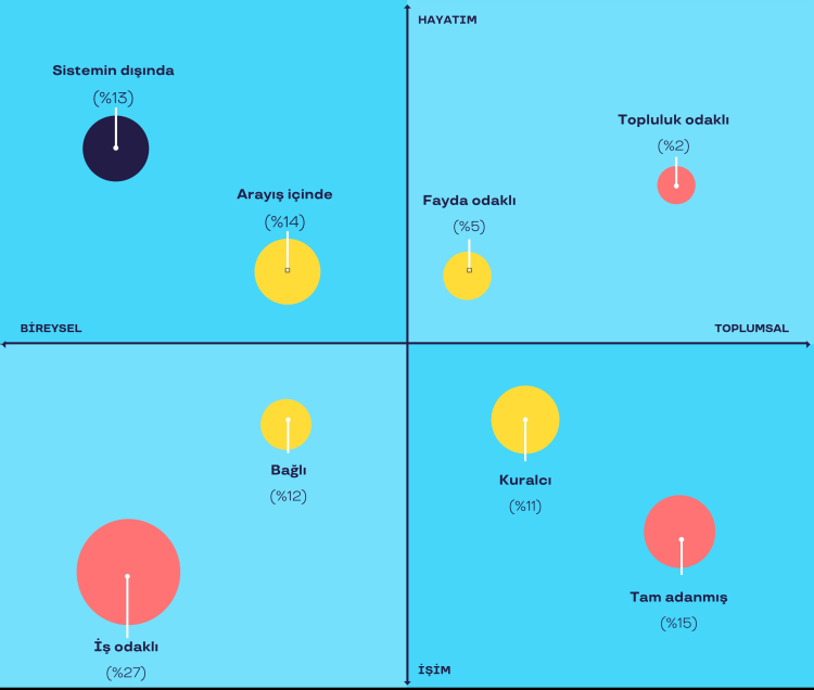 Araştırma, çalışan bağlılığının artık "ya tamamen adanmış ya da kopmuş" gibi keskin tanımlarla açıklanamayacağını gösteriyor. Bağlılık; hayatın farklı evreleri, kişisel öncelikler ve bireyin içinde bulunduğu koşullara göre ton değiştiriyor. Bu dönüşümü bireyin özel hayatına verdiği önem ve kişisel hedefleriyle toplumsal aidiyet arasında kurduğu denge olmak üzere iki temel eksen üzerinden ele alan araştırma, sekiz farklı bağlılık profili ortaya koyuyor. Araştırmada bağlılık, sabit bir tutum değil; hayatla birlikte şekillenen, esneyen ve yeniden ayarlanan canlı bir deneyim olarak karşımıza çıkıyor.