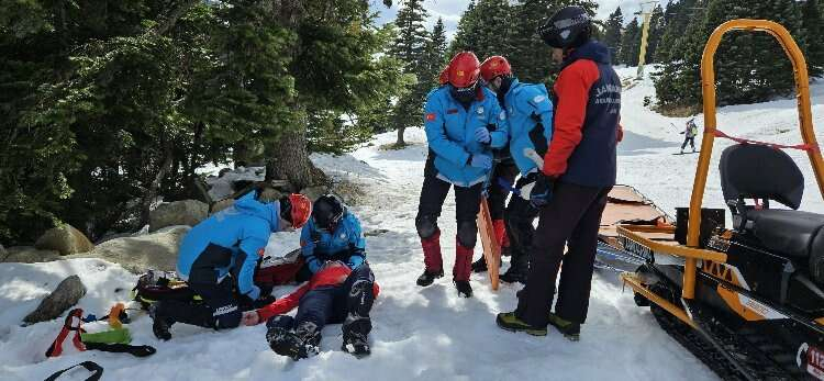 In Uludağ, the center of winter tourism, a joint winter exercise was conducted with the participation of AFAD (Disaster and Emergency Management Presidency), UMKE (National Medical Rescue Team), JAK (Search and Rescue Association), and Bursa Metropolitan Municipality Fire Department teams. According to the scenario, skiers who fell and were at risk of freezing or getting lost in the snow were raced against time and attempted to be evacuated from their location as quickly as possible.