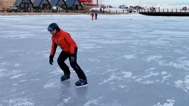 In Erzincan's Ergan Ski Resort, Ardıçlı Lake, covered with ice due to the cold weather, saw some citizens enjoying ice skating. In the city where the temperature dropped to as low as minus 10 degrees Celsius in higher altitudes, the surface of Ardıçlı Lake, located at the Ergan Mountain Winter Sports and Nature Tourism Center, froze. The frozen lake and its surroundings created a beautiful landscape. On the surface of the lake, covered with ice and having a depth of 5 meters, some citizens had fun by ice skating.
