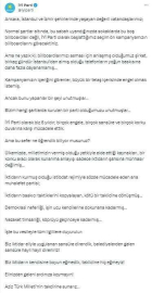 "Kampanyamızın içeriğini görenler, büyük bir telaş içerisinde engel olmak istemiş. Ancak bunu yapanlar bir şeyi unutmuşlar. Bizim hangi şartlarda kurulan bir parti olduğumuzu unutmuşlar. İYİ Parti olarak biz 6 yıldır birçok engele, birçok sansüre ve birçok korku duvarına karşı mücadele ettik. Ama bu sefer ne öğrendik biliyor musunuz? Ülkemizde, milletimizin vermiş olduğu yetkiyle elde ettiği kaynakları, bir korku aracı olarak kullanma anlayışı sadece iktidarın şahsına münhasır değilmiş. İktidarın kurmuş olduğu istibdat rejimiyle sözde mücadele eden ana muhalefet partisi iktidarın baskıcı taktiklerini kopyalayan, kötü bir taklidine dönüşmüş. Demokrasi neferliği, işin ucu kendilerine dokunana kadarmış. Nezaket timsalliği, köprüyü geçinceye kadarmış. İşte bu vesileyle tüm ilgililere duyurulur; biz iktidar eliyle uygulanan sansüre direndik, belediyelerden gelen sansüre hayli hayli direniriz. Biz iktidarın kendisine boyun eğmedik, taklidine hiç eğmeyiz. Elinizden geleni ardınıza koymayın."