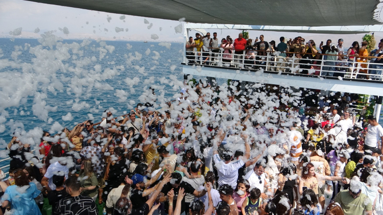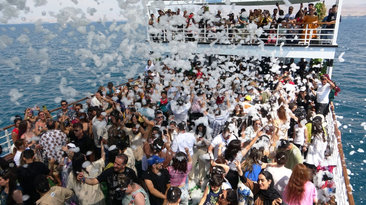Okulların tatil olması nedeniyle Van'a gelen İranlı turistler, tekne ile açıldıkları Van Gölü'nde köpük partisi yaparak eğleniyor.